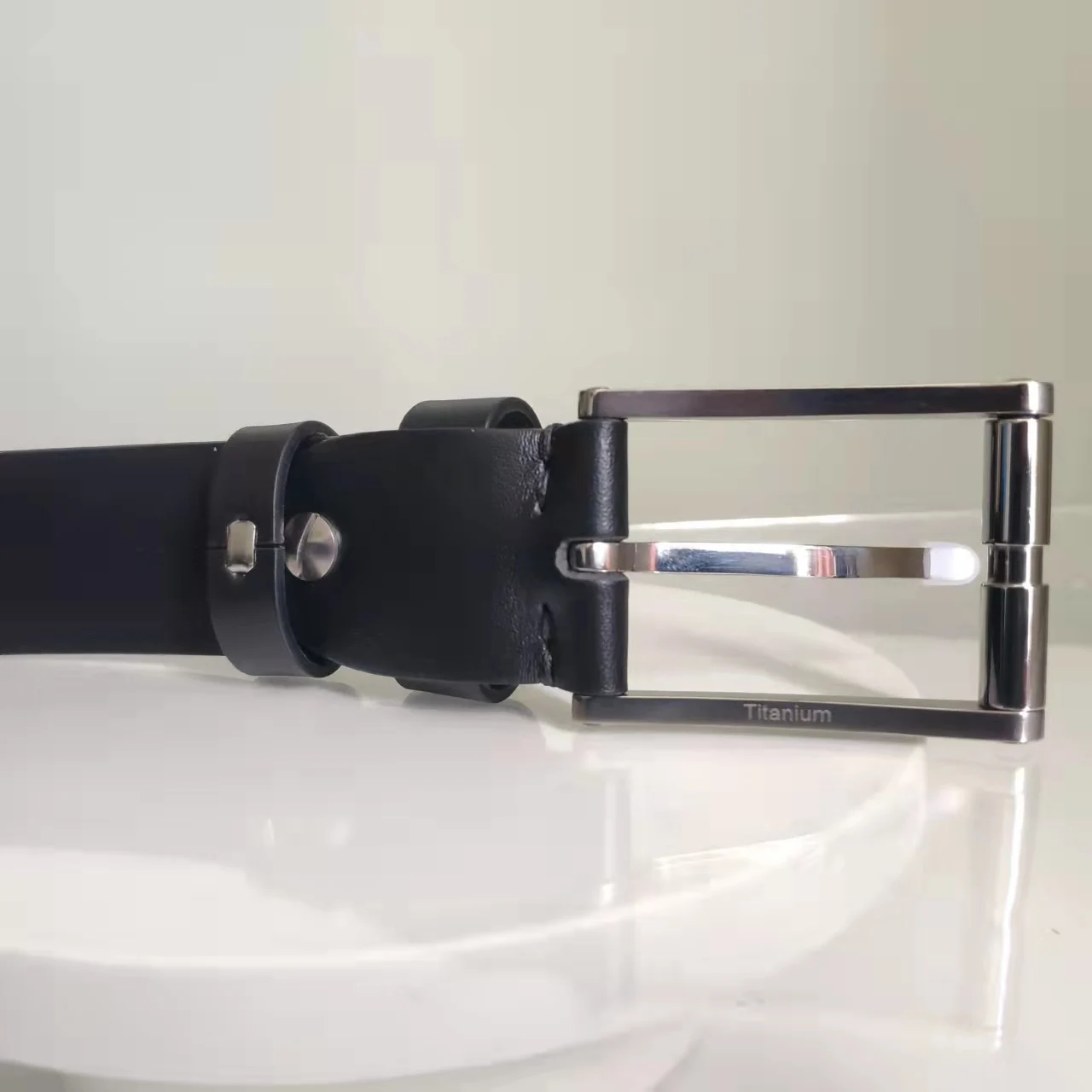 35mm Pure Titanium Pin Buckle Black Leather Belt Strap Full Grain Cowhide One Piece Screw for Fashionable Men And Women