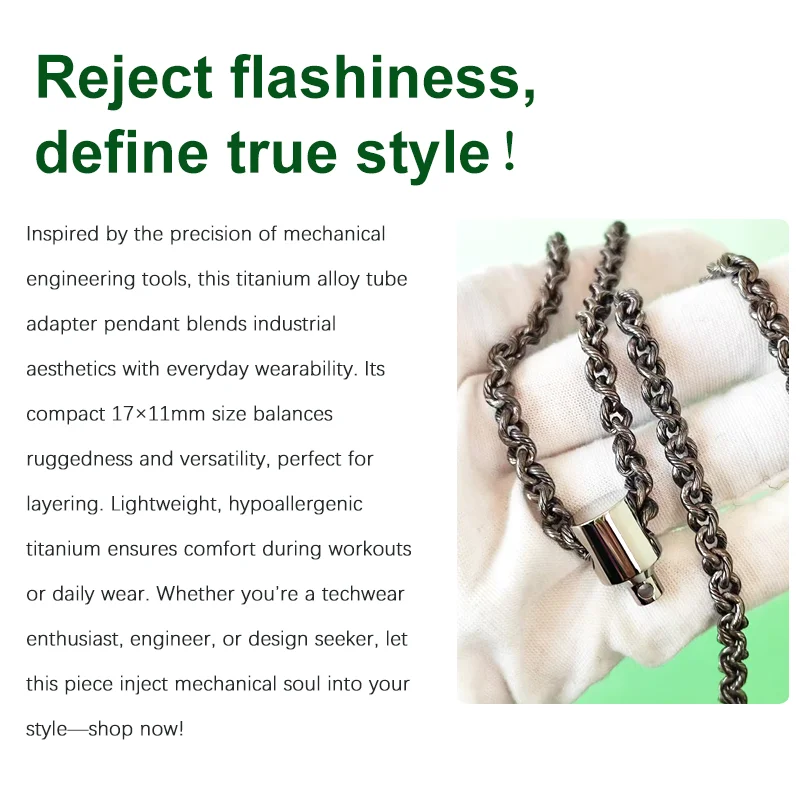 This Mechanical Adapter Titanium Pendant Necklace measures 17x11MM, featuring a minimalist industrial design that blends tech and fashion. Made from titanium, it's lightweight (just a few grams) and hypoallergenic, ideal for sensitive skin. Unisex and comfortable for daily wear, it showcases a unique industrial style. Perfect with techwear or minimalist outfits to elevate your look. High-quality craftsmanship ensures durability and no fading, making it a top choice for trendsetters. Buy now and enjoy the charm of unique tech jewelry!