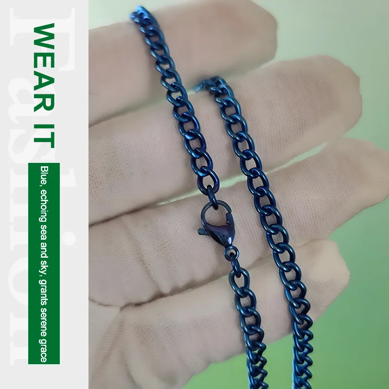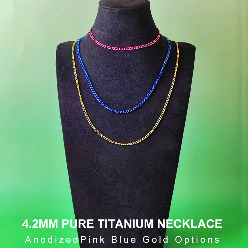 This light luxury pure titanium necklace features a 4.2mm thin chain with anodized gold, pink, and blue colors. Gold is inspired by warm sunshine, symbolizing confidence and energy; pink resembles cherry blossoms, offering soft romance; blue echoes the deep sea, reflecting calm elegance. Titanium is lightweight, durable, and hypoallergenic, perfect for daily wear. Adjustable length fits various outfits, enhancing your overall style. Ideal for fashion women, suitable for parties, work, or casual occasions. Beautifully packaged, great for gifts or personal use.