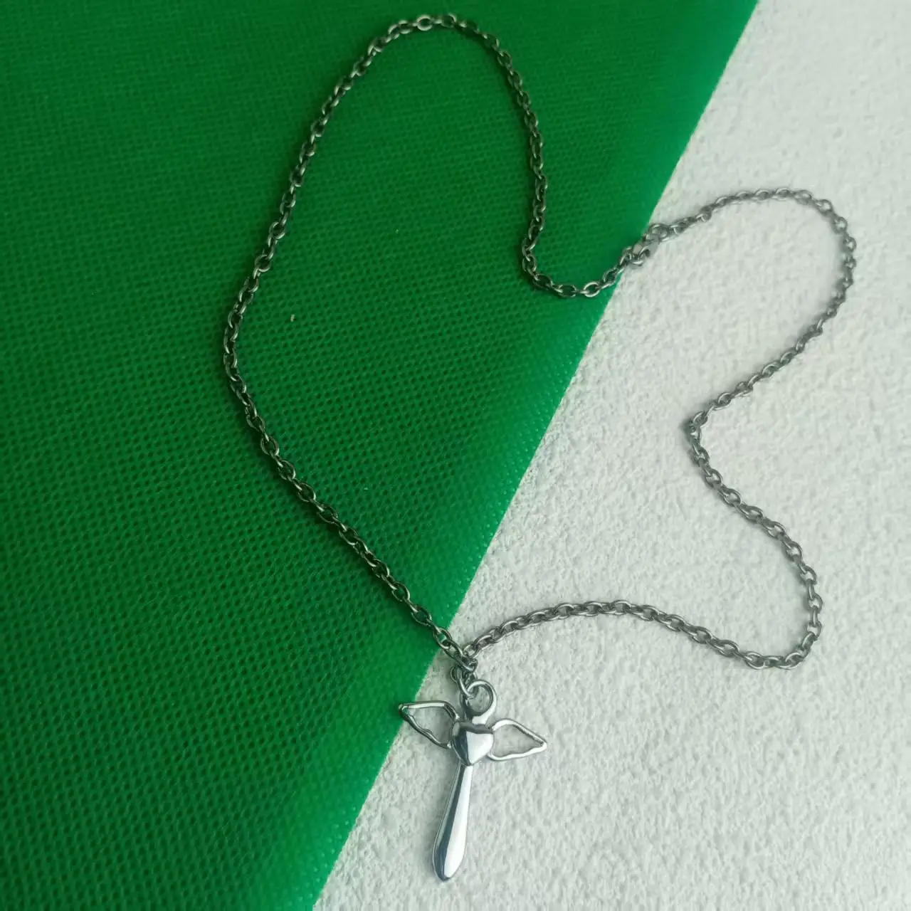 Featuring an elegant angel wing cross pendant, this piece adds a touch of faith and fashion to any outfit.