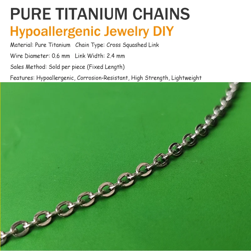 Crafted from aerospace-grade pure titanium, this cross squashed chain is for those who value quality and creativity. 0.6mm ultra-fine wire with 2.4mm flattened links offers a subtle modern shine. 100% hypoallergenic—safe for sensitive skin all day. Ultra-high strength prevents deformation; corrosion resistance surpasses seawater environments. Each chain is precision-cut to fixed length, ready to use for: