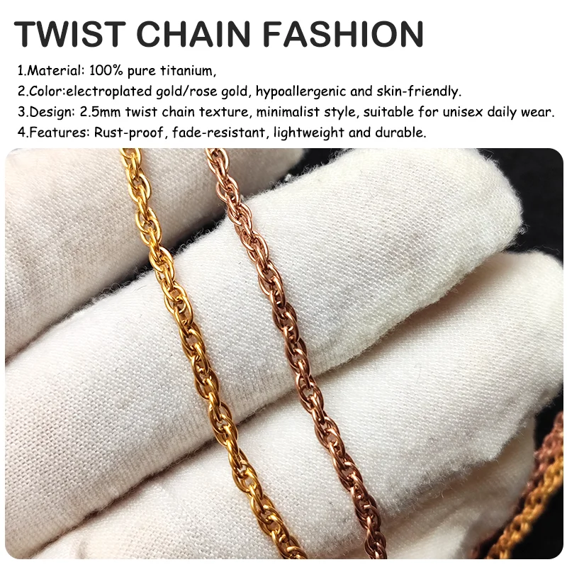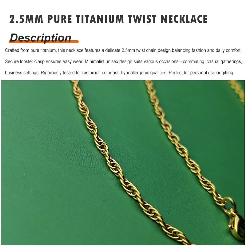 Crafted from pure titanium, this necklace features a delicate 2.5mm twist chain design balancing fashion and daily comfort. Titanium's natural hypoallergenic properties make it ideal for sensitive skin. Advanced plating technology offers gold and rose gold options with lasting color. Secure lobster clasp ensures easy wear. Minimalist unisex design suits various occasions—commuting, casual gatherings, business settings. Rigorously tested for rustproof, colorfast, hypoallergenic qualities. Perfect for personal use or gifting.