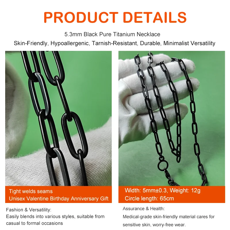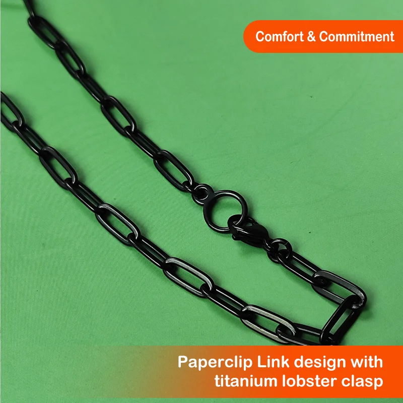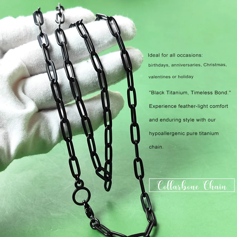 This 5mm black pure titanium paperclip chain necklace seamlessly blends strength with subtlety. Hypoallergenic and comfortable for 24/7 wear, it’s more than an accessory—it’s a statement. Perfect for marking milestones or expressing personal style, its deep black hue embodies power, mystery, and timeless elegance.